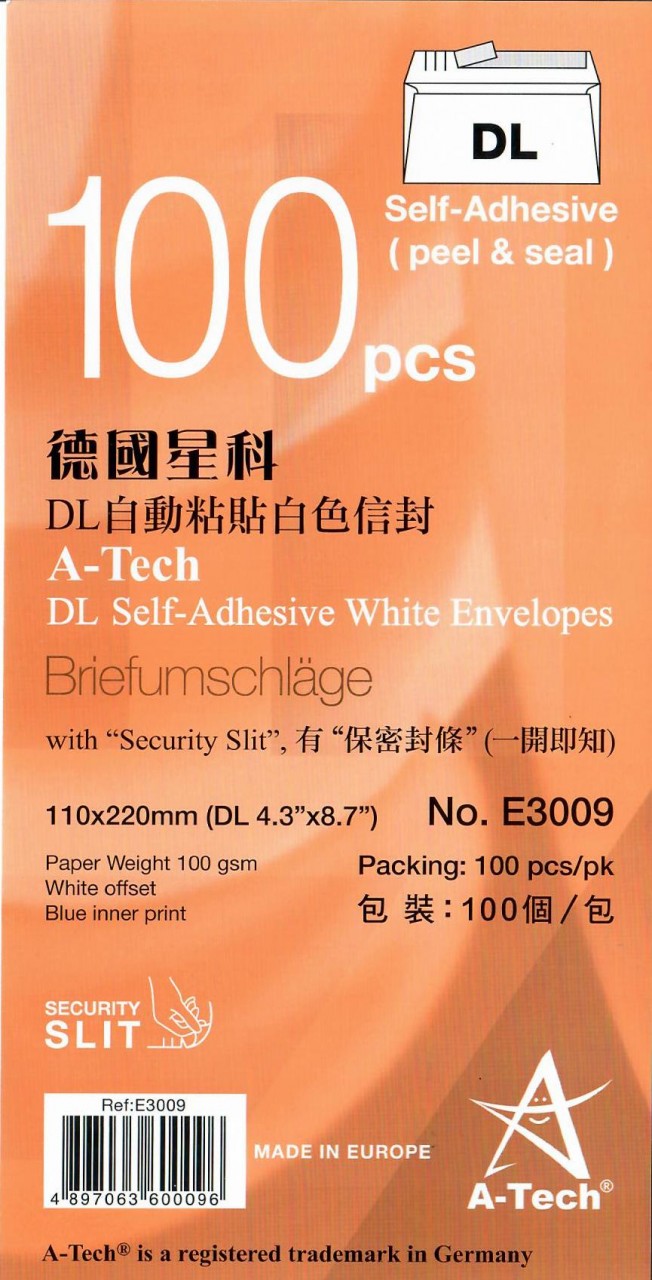 【貨品名稱】德國星科 A-Tech E3009 DL 自動黏貼信封(保密封條) 100個裝