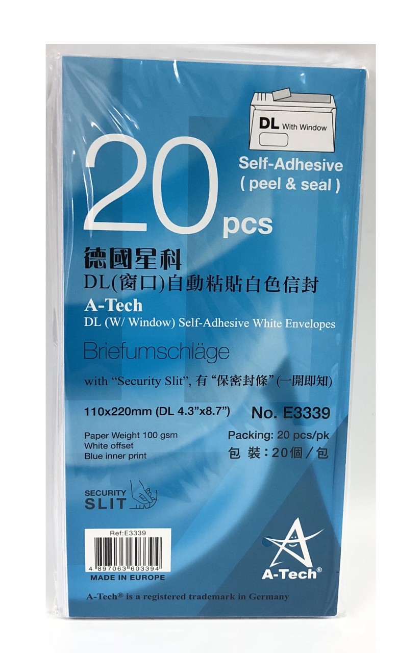 【貨品名稱】德國星科 A-Tech E3339 DL<窗口>自動黏貼信封(保密封條) 20個裝