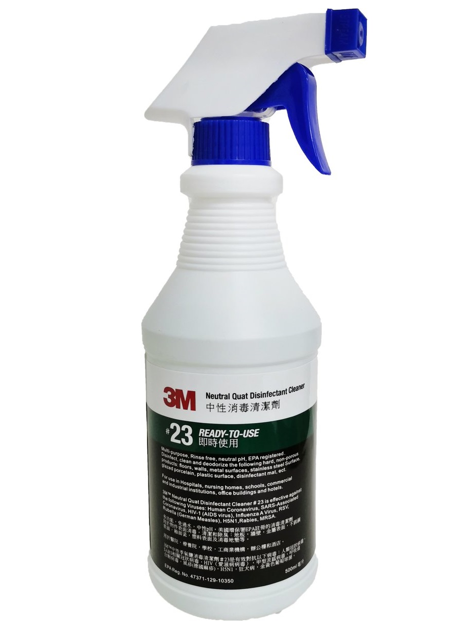 3M™中性季氨鹽消毒清潔劑#23是有效對抗以下病毒:人類冠狀病毒,SARS相關冠狀病毒,HIV(愛滋病病毒),甲型流感病毒,呼吸道合胞病毒,風疹(德國麻疹),H5N1,狂犬病,金黃色葡萄球菌。多功能,免過水,中性pH,美國環保署EPA註冊的消毒清潔劑用於物件表面消毒,清潔和除臭:地板,牆壁,金屬表面,不銹鋼表面,釉面瓷,塑料表面及消毒地墊等。用於醫院,療養院,學校,工商業機構,辦公樓和酒店。