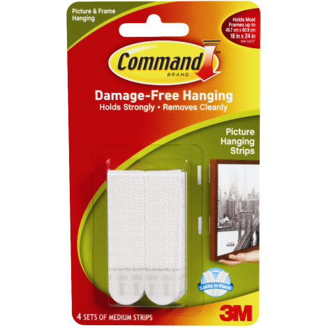 - Damage-Free Hanging - No nail holes - Holdes strongly and removes cleanly - Picture locks in place - Works on a variety of surfaces - Weight Capacity: 3 pounds per set - Package Contents: 4 sets of strips |