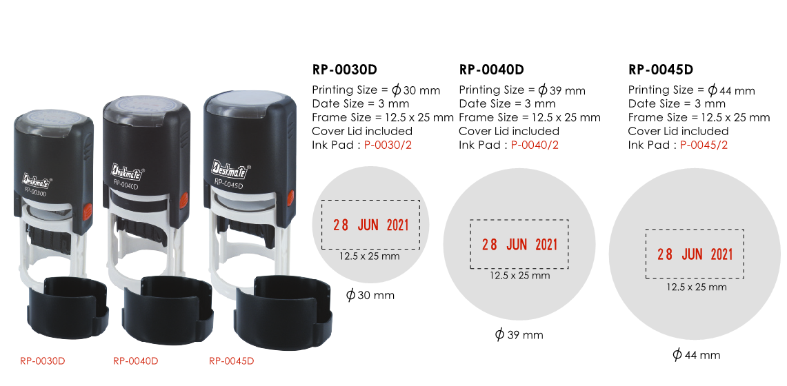 Click the button below to add the Deskmate RP-0045D 訂造圓形回墨日期印章(直徑 Ø44mm) to your wish list.