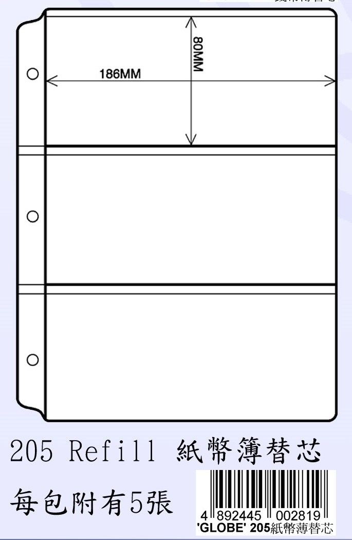 【貨品名稱】GLOBE NO.205R 活頁紙幣簿替芯(5張)