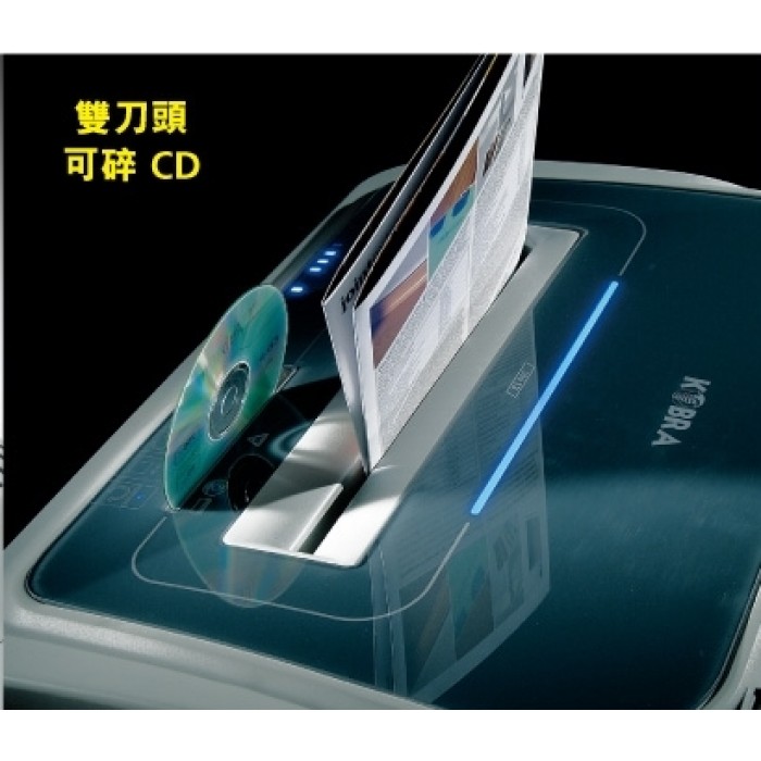 Carbon hardened cutting knives, unaffected by staples and metal clips. High precision design of cutting knives allows high shred loads with low power consumption. Motor thermal protection. 24 hours continuous duty motor: no duty cycle or timed cool down period. Bag full stop with light signal. Two separate set of cutting knives: one for paper and one for CDs. Two distinct integrated removable bins for separating shredded paper from plastic shreds. KOBRA 310 TS shreds transparent material too: keeping the finger for 5 seconds on the forward control and the machine works continuously for 30 seconds.