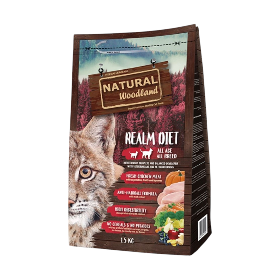 Realm Diet 是一種含有高度消化的新鮮和乾雞肉的貓糧。此飲食不含穀物和土豆,並採用含有麥芽萃取物的防毛球配方,可防止胃中形成毛球。 採用新鮮雞肉製成,肉類成分含量達69%,代謝量達4,050大卡/公斤。 飲食配方不含麩質、馬鈴薯、乳糖、人工色素、香料和防腐劑。 成分:脫水雞肉(42%),新鮮雞肉(15%),豌豆,木薯粉,雞油(7%),水解雞肝(3%),鮭魚油(2.2%),豌豆蛋白,啤酒酵母,蘋果果肉、角豆、礦物質、水果(梨子、蘋果和蔓越莓)(3. 000 毫克/公斤)、蔬菜(南瓜、胡蘿蔔、菠菜、綠花椰菜和生薑)(3.000 毫克/公斤)、迷迭香、麥芽萃取物(500 毫克) /公斤)。 營養分析:粗蛋白(40%)、粗油脂(19%)、粗纖維(2.5%)、粗灰分(9%)、鈣(1.8%)、磷(1.4%)、鎂(0.1%) 、澱粉(16.5%)、歐米伽3脂肪酸(0.30%)、歐米伽6脂肪酸(3%)。 營養添加物:維生素A 18,000 IU/kg、維生素D3 1,750 IU/kg、維生素E 600 mg/kg、維生素C 100 mg/kg、鐵75 mg/kg、碘3.5 mg/kg、銅10 mg/kg、錳7.5 毫克/公斤、鋅120 毫克/公斤、硒0.12 毫克/公斤、牛磺酸1,000 毫克/公斤、DL-蛋氨酸750 毫克/公斤。技術添加物:天然抗氧化劑(生育醇)。
