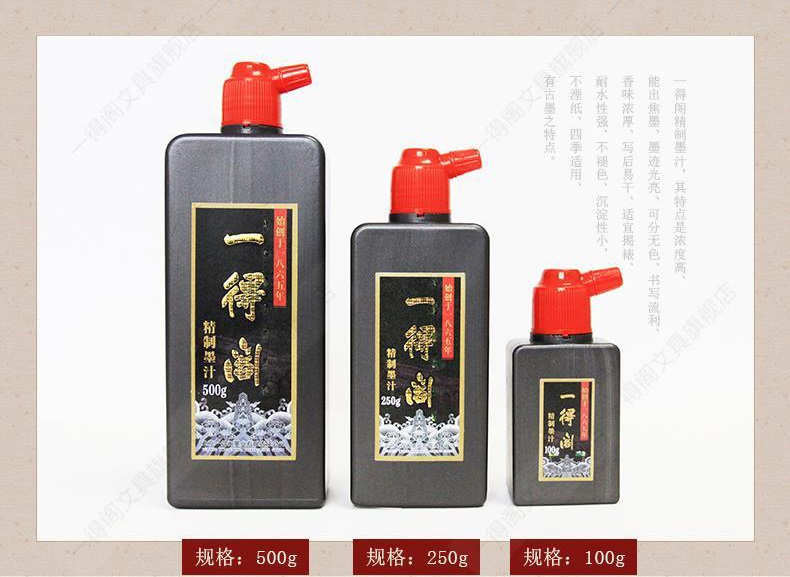 一得閣精製墨汁可歸納為墨跡光亮,宜書宜畫,耐水性強,書寫流利,寫後易幹,不湮紙,不退色,適宜拓裱,色澤光亮墨濃、氣味清香、其超群之 已出焦墨,層次豐富。 能分焦、濃、重、淡、清五色,有古墨之特色。 充分體現中國傳統水墨畫的意境,遇見冷凝凍,稍溫即可使用。因此得到了廣大書畫家和大眾的一致認可。 一得閣墨汁先後被評為輕工業部優質產品,連續多次被評為中國文房四寶「國之寶」產品。