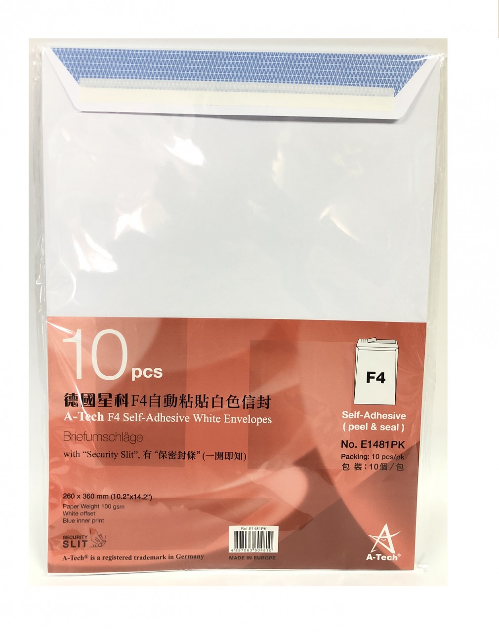 【貨品名稱】德國星科 A-Tech E1481 F4 自動黏貼信封(保密封條) 10個裝