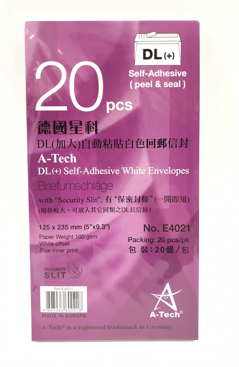 【貨品名稱】德國星科 A-Tech E4021 DL+ 加大自動黏貼信封(保密封條) 20個裝