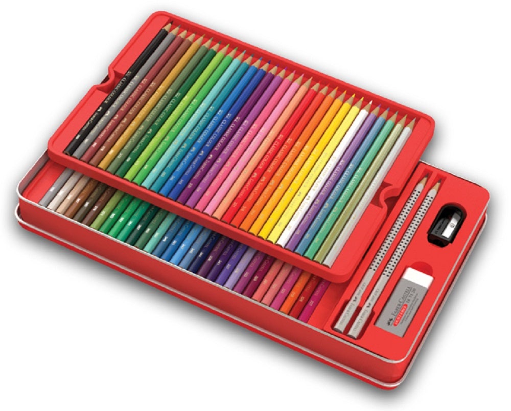 • 60 bright colours, 2 Grip graphite pencils, eraser and sharpener in metal box