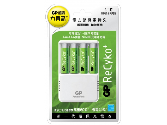 【貨品名稱】GP ReCyko+ 2小時環保節能充電器連GP ReCyko+ AA充電池4粒 PB70